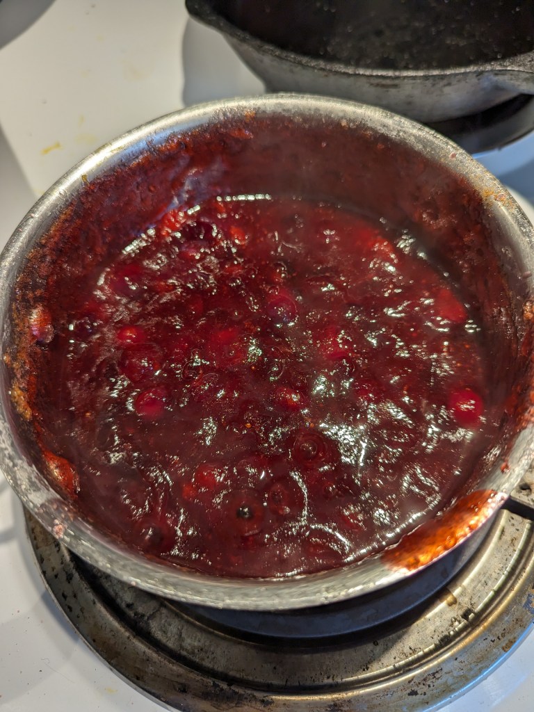 Heat ingredients in a sauce pan on medium until sugar is melted and cranberries all pop. Serve warm or cold. Put extra in a mason jar and use as jelly for your morning toast for the week.